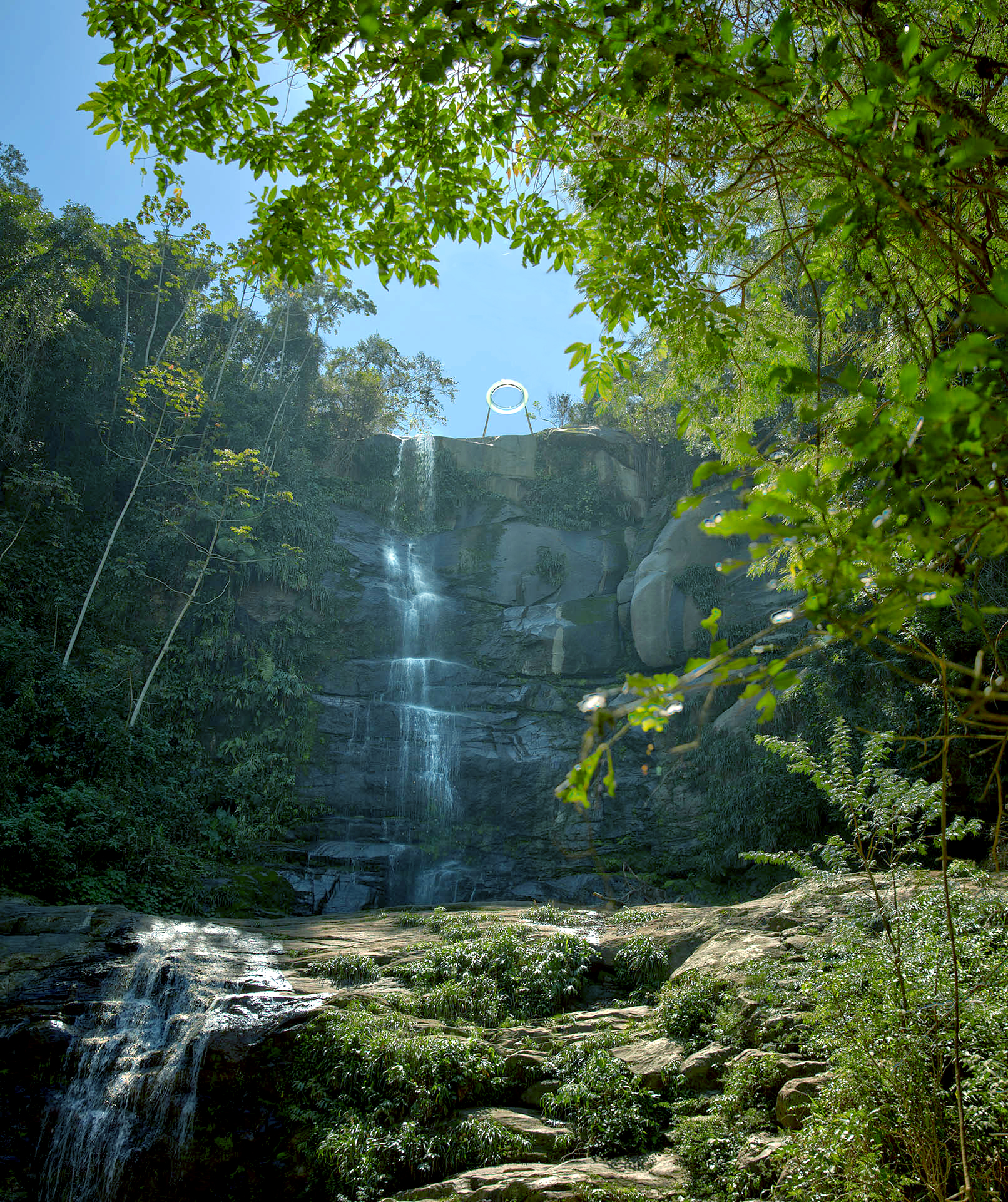 JAPANESE ARTIST MARIKO MORI INSTALLS MONUMENTAL SCULPTURE AT THE TOP OF A WATERFALL IN RIO